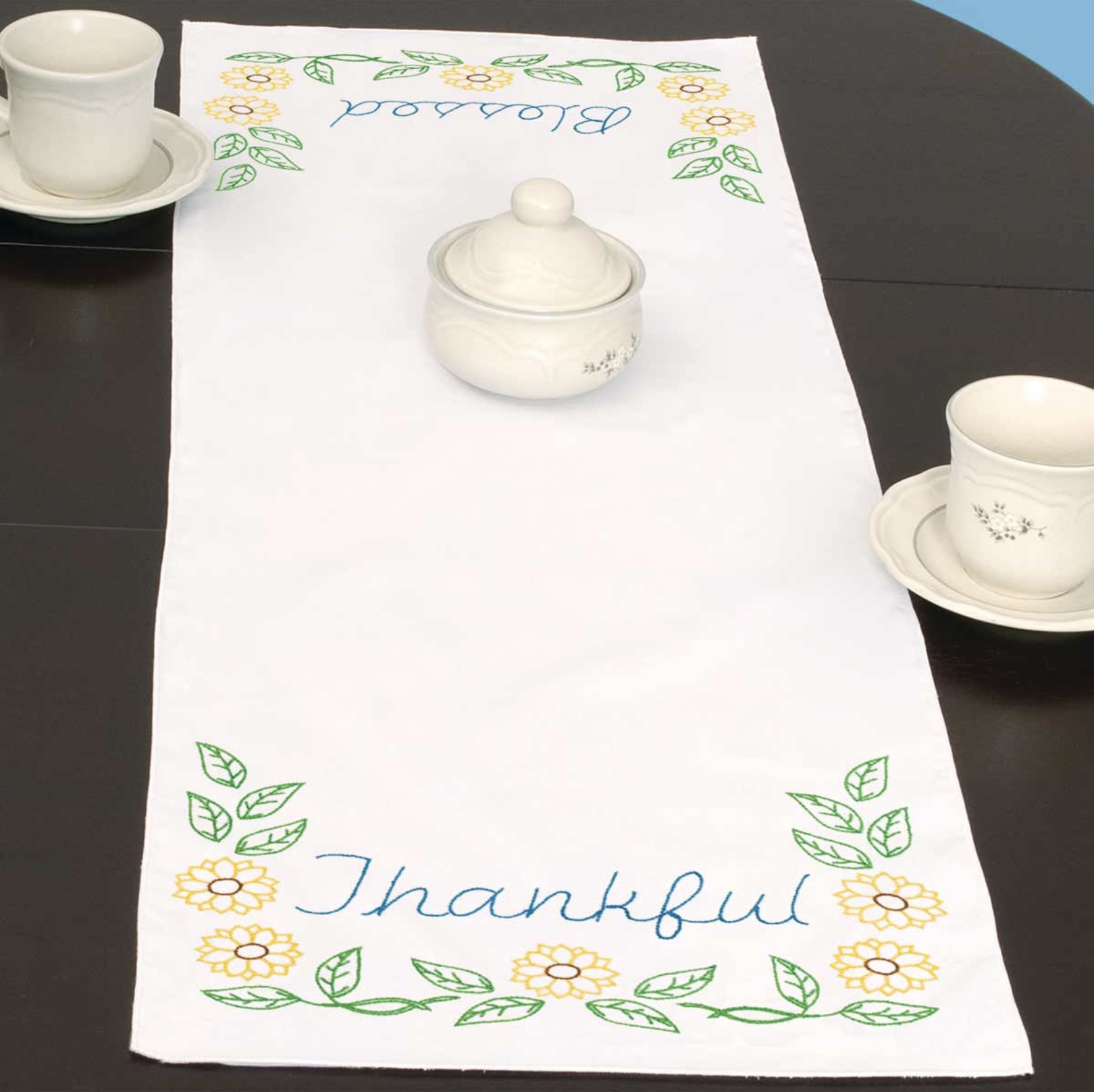 One 15” x 42” table runner/scarf with finished edge, made of cotton/poly broadcloth with easy to follow instructions. Ink washes out.